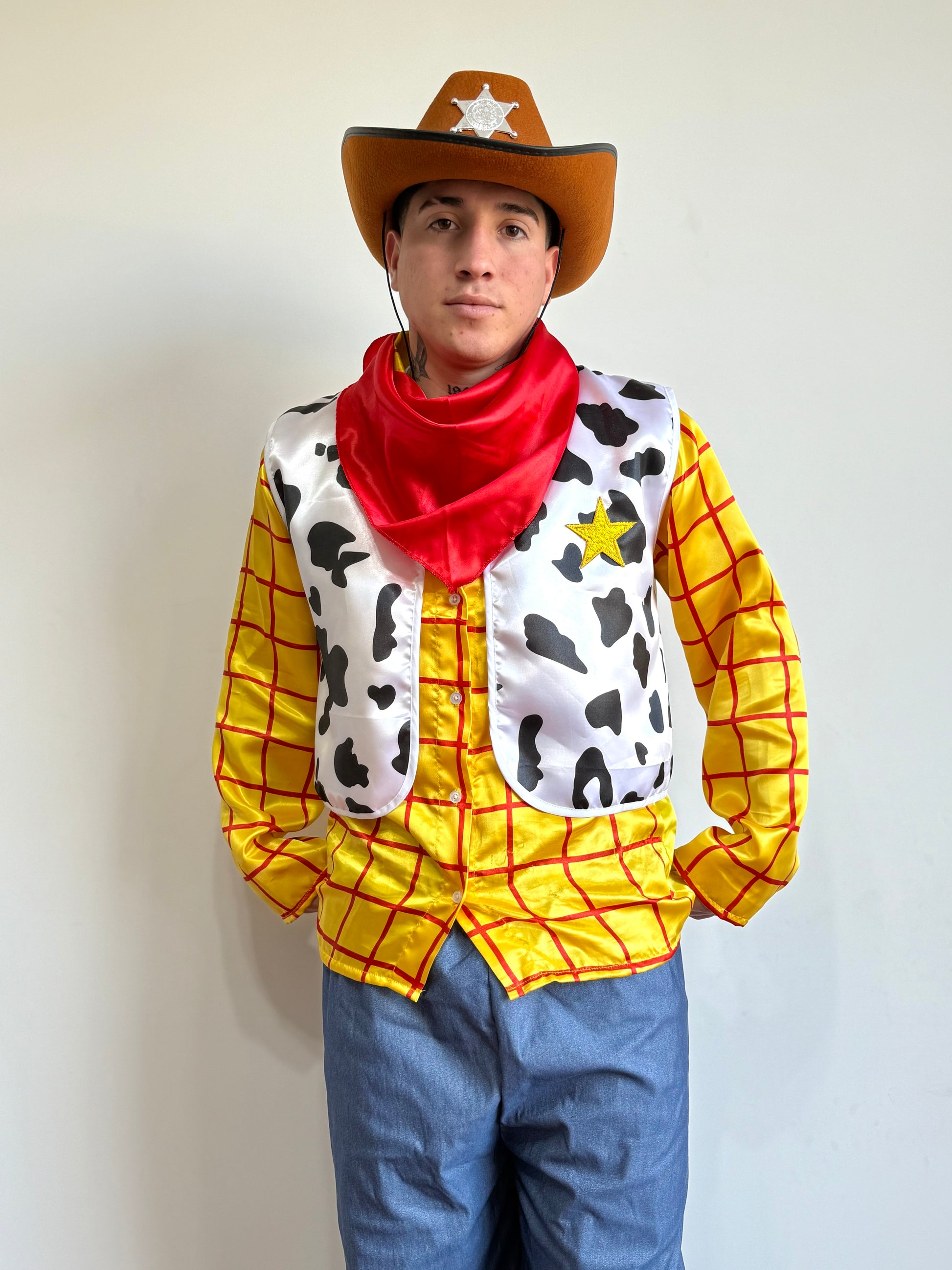 El disfraz de Woody incluye camisa amarilla con cuadros, chaleco de vaquero con estampado de vaca, pañuelo rojo, pantalón y sombrero marrón.