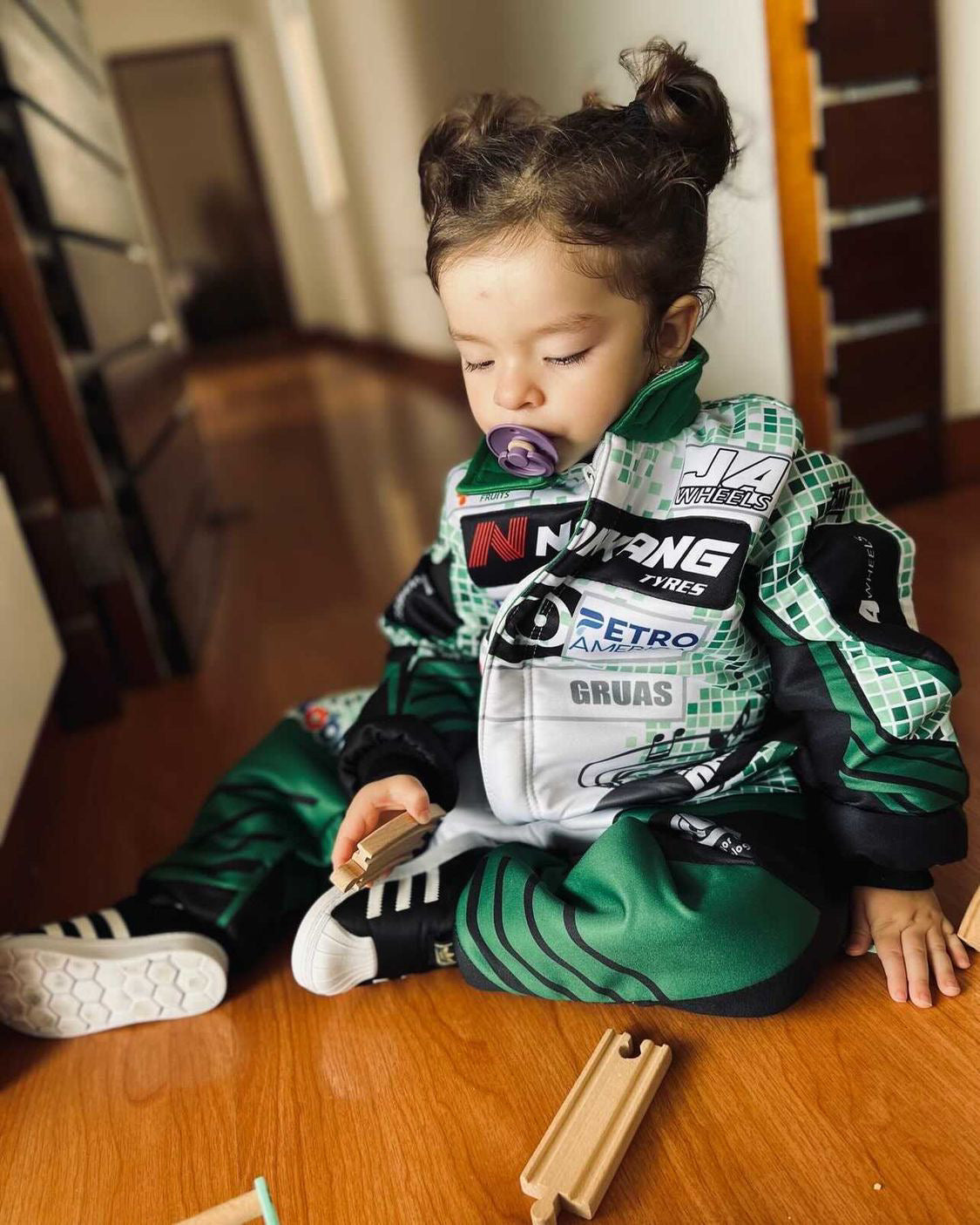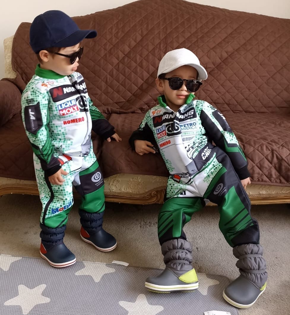 El disfraz de Piloto de carreras esta hecho en tela gabardina.